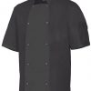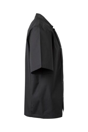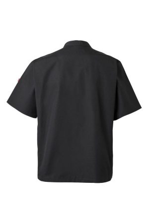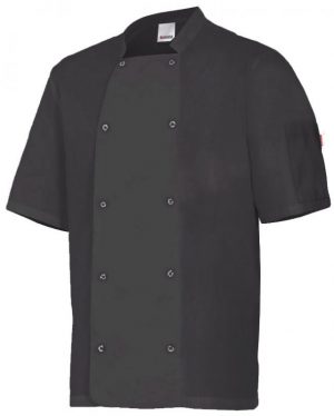 Chaqueta de cocina unisex de manga corta con cierre de botones automáticos. Diseño cómodo y funcional ideal para entornos profesionales.