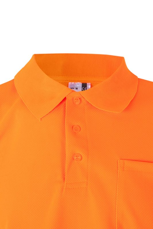 Polo de alta visibilidad con cintas reflectantes, tejido transpirable y diseño funcional para trabajos en exteriores con visibilidad reducida.