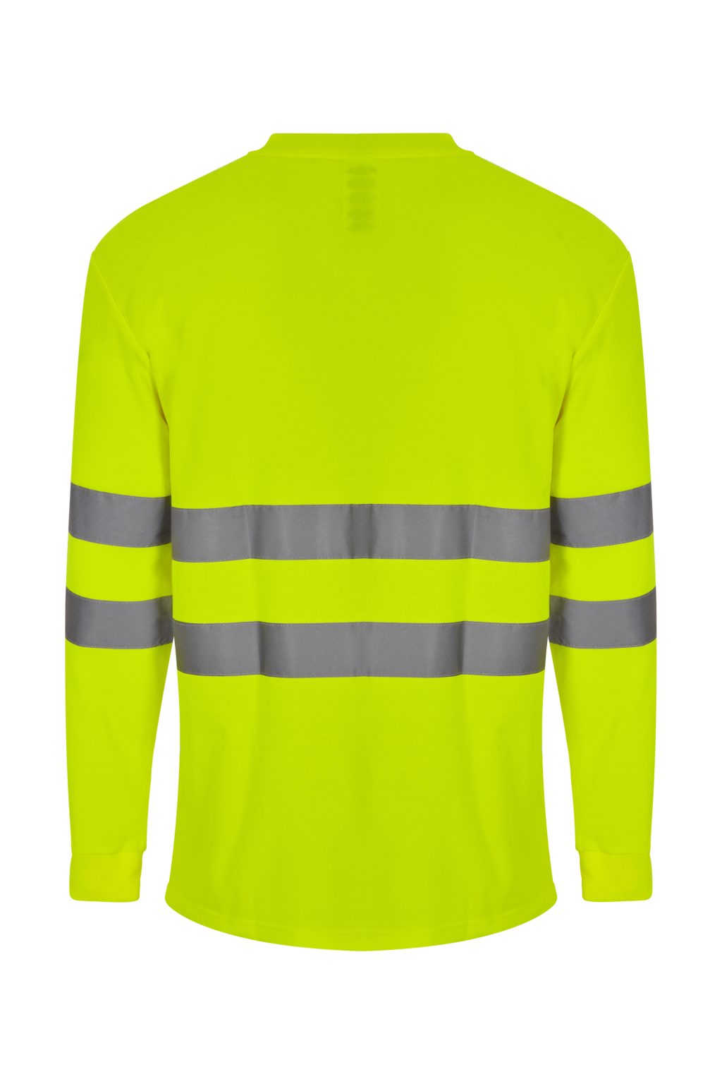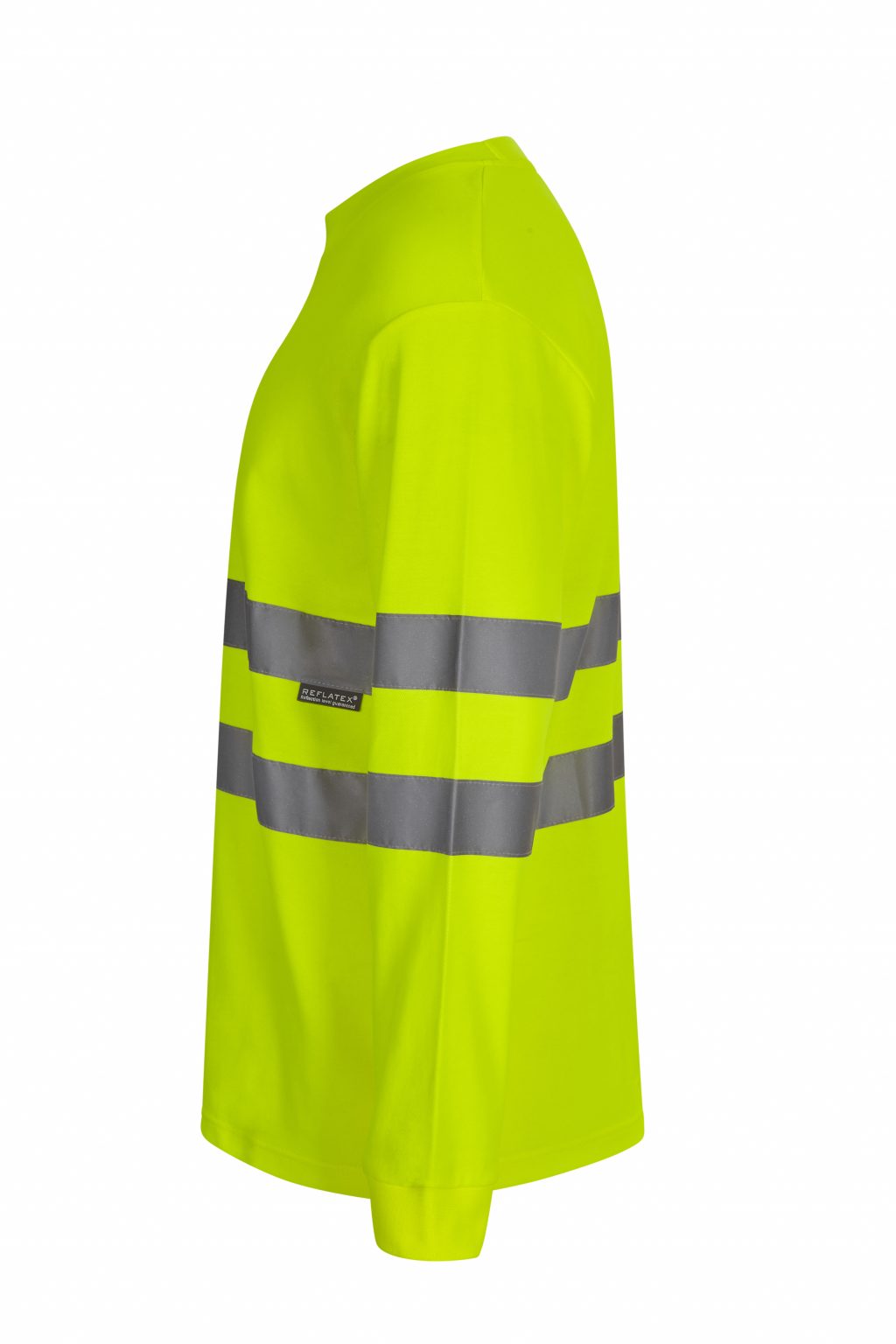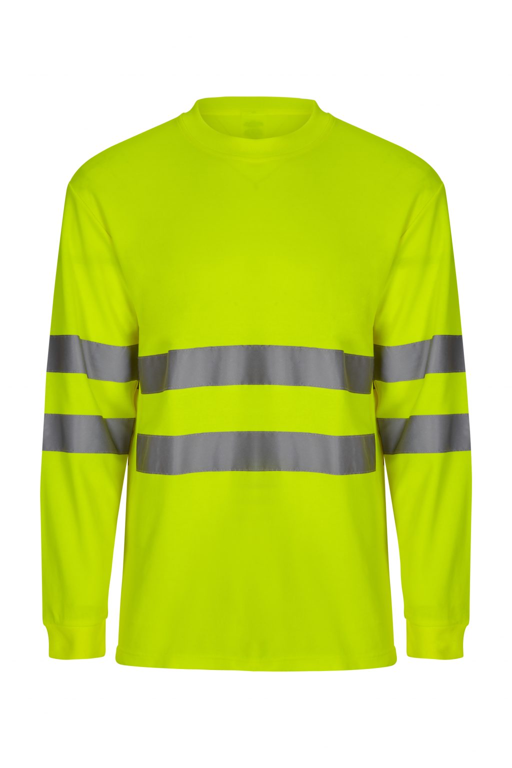 Camiseta de manga larga de alta visibilidad con cintas reflectantes y puños canalé. Tejido piqué mezcla algodón/poliéster. Certificación EN 20471 Clase 2.