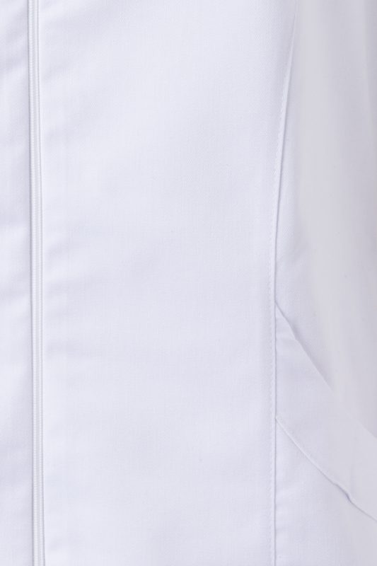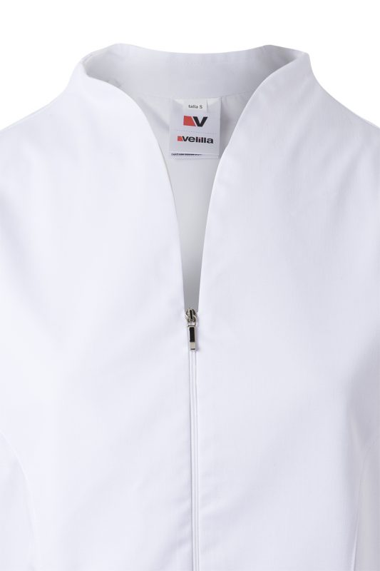Chaqueta de trabajo para mujer, semientallada, con manga corta, cremallera central y cuello chimenea. Cómoda, profesional y con diseño moderno.