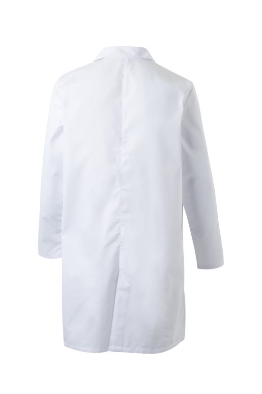 Bata unisex de sarga con cierre central de botones, tres bolsillos y abertura trasera. Ligera, resistente y apta para uso profesional diario.