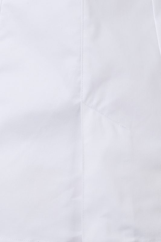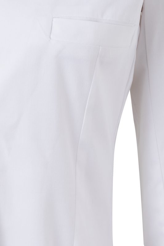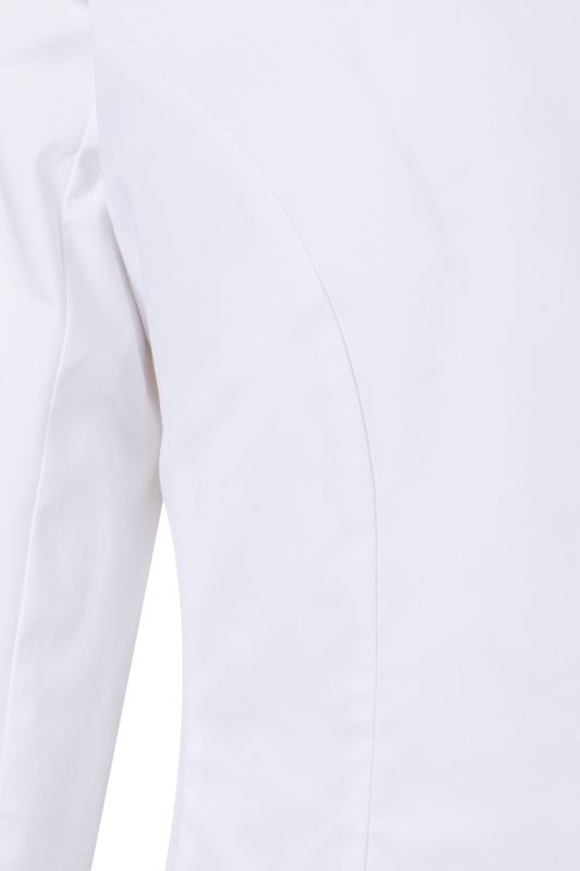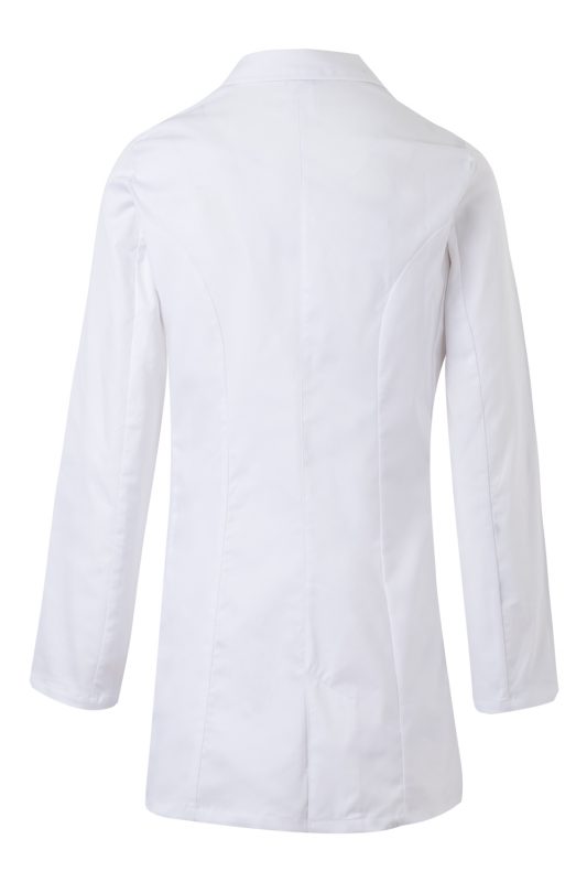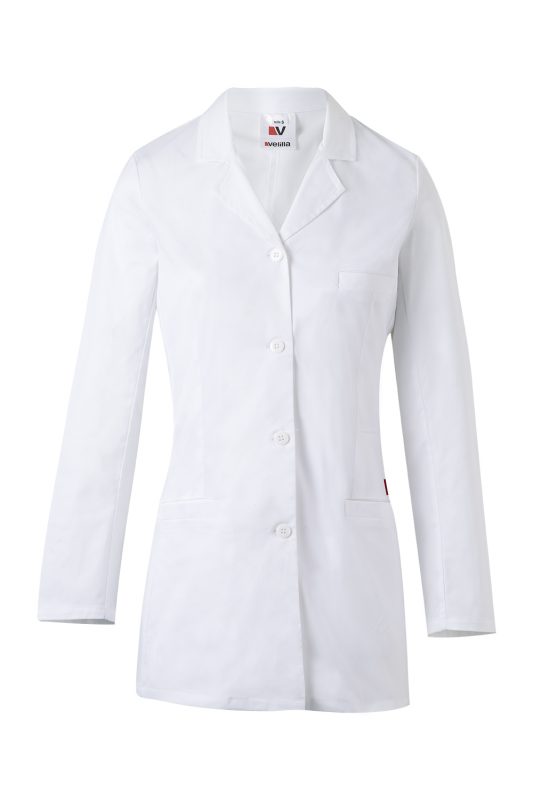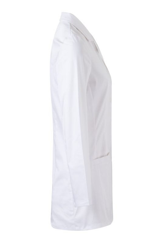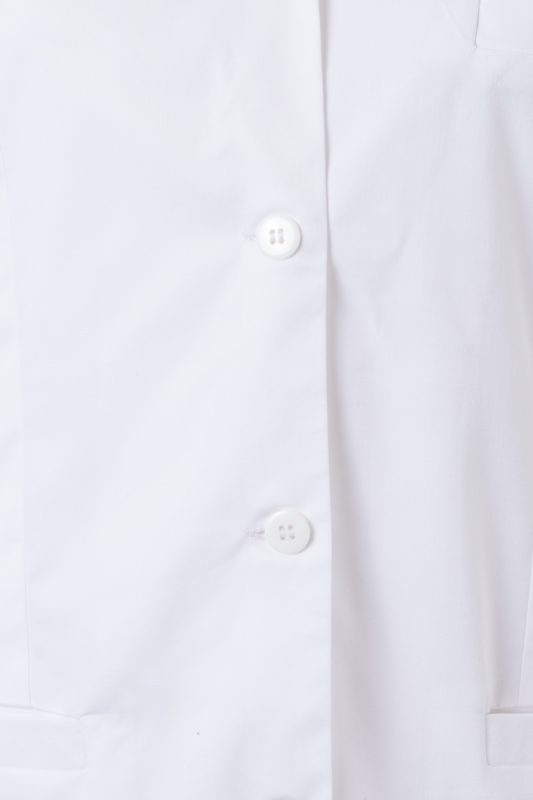 Bata corta para mujer, semientallada, con tejido elástico y bolsillos de vivo. Ligera, profesional y cómoda para el trabajo diario.