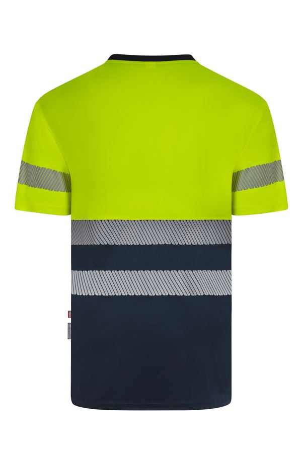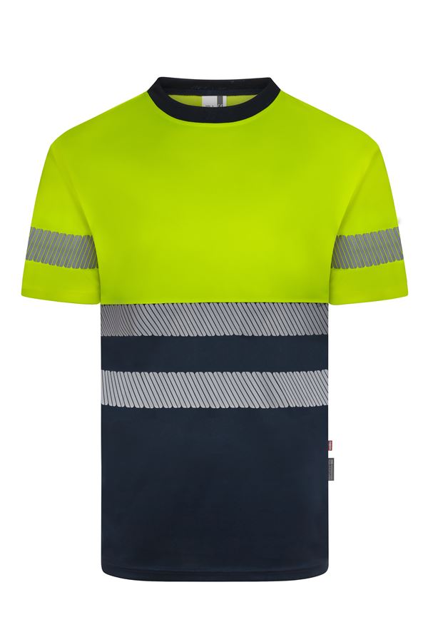 Camiseta bicolor de manga corta con cintas reflectantes segmentadas. Alta visibilidad clase 1, tejido reciclado con certificación GRS y protección solar UPF 50+.