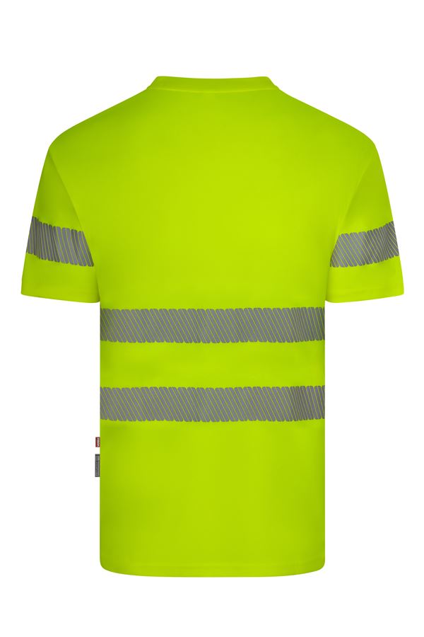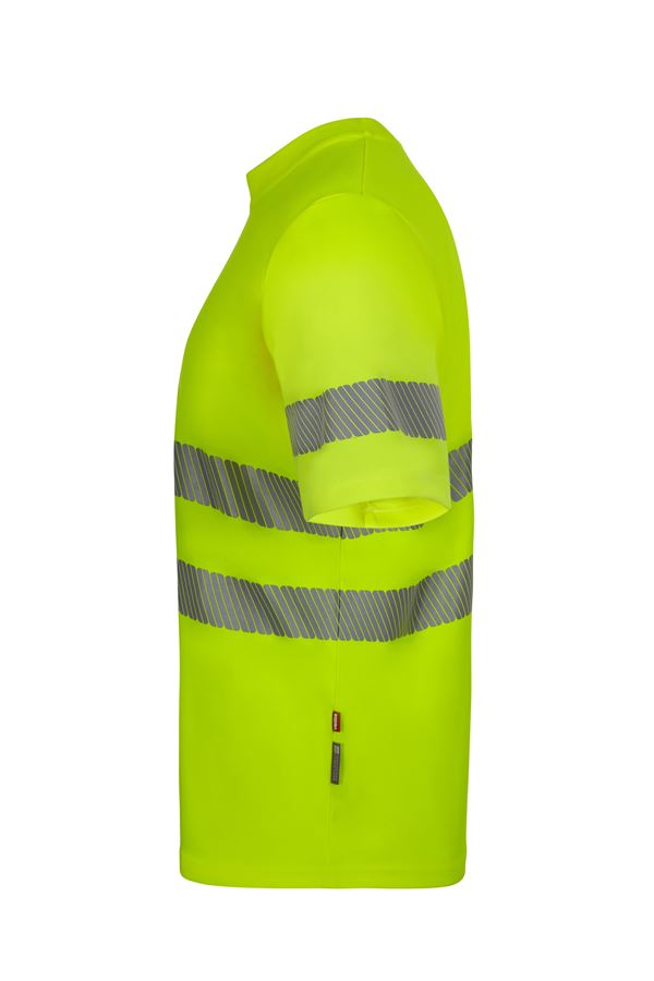 Camiseta técnica de manga corta en poliéster reciclado con cintas segmentadas. Alta visibilidad clase 2, protección solar UPF 50+ y certificado GRS.