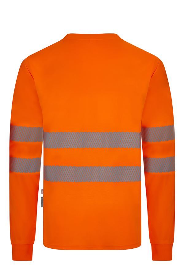Camiseta de manga larga con cintas segmentadas en tejido reciclado. Alta visibilidad clase 2, protección solar UPF 50+ y certificación GRS.
