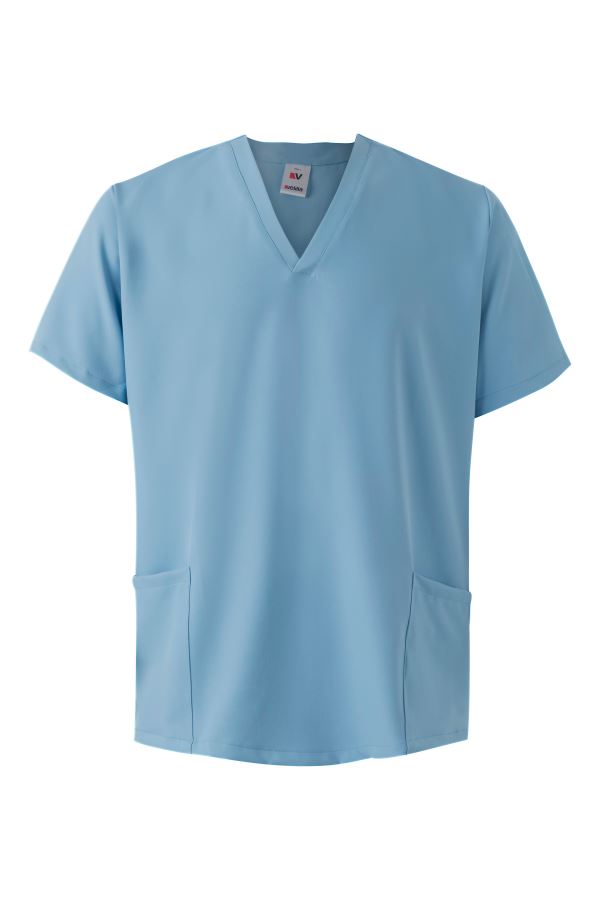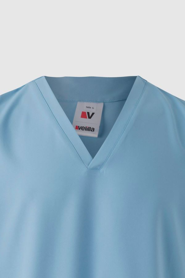 Camisola de microfibra manga corta con cuello en pico, tratamiento antibacterias y tejido repelente de líquidos. Funcional y ligera, ideal para uso profesional.