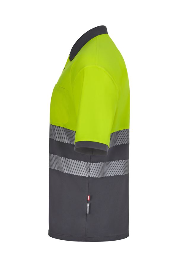 Polo bicolor de manga corta fabricado en poliéster reciclado, con cintas reflectantes segmentadas, ideal para trabajos que requieren visibilidad y protección solar.