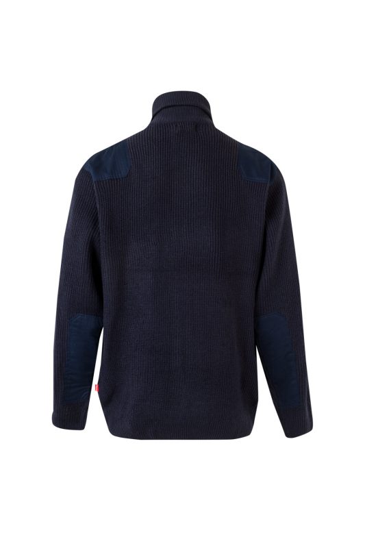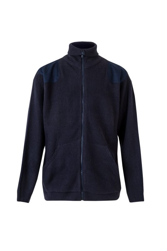 Chaqueta de punto grueso con cierre de cremallera, cuello alto, refuerzos en hombros y codos, y dos bolsillos. Tratamiento antipilling. Gama Clásicos.
