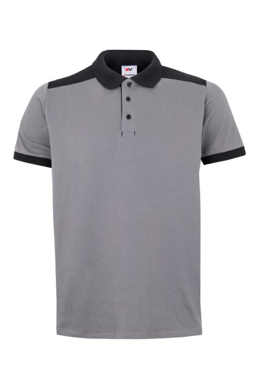 Polo bicolor stretch de trabajo manga corta con detalles en contraste, cuello y mangas en canalé, aberturas laterales y cierre de botones. Gama Solid Match.