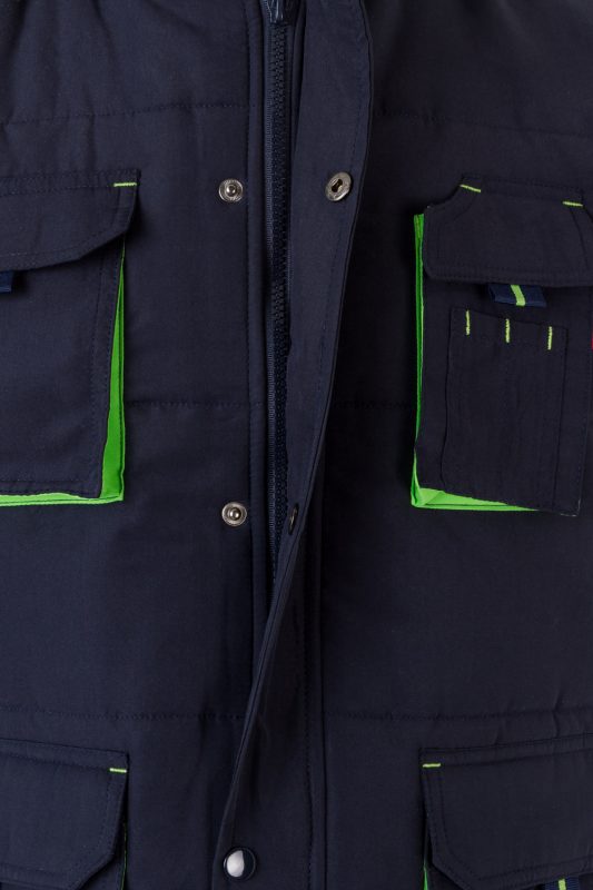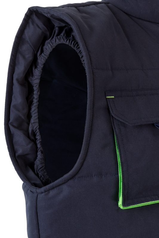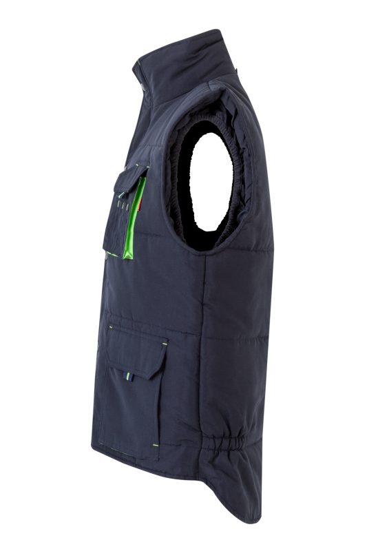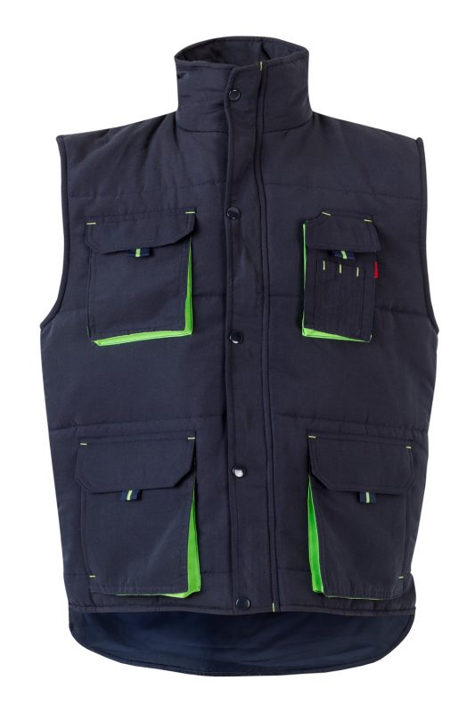 Chaleco acolchado bicolor con múltiples bolsillos funcionales, cierre con tapeta y detalles en contraste. Ideal para el trabajo al aire libre.
