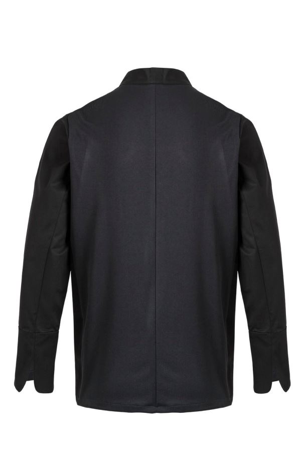 Chaqueta de cocina profesional con diseño asimétrico y tejido técnico transpirable en la espalda. Comodidad y frescura para largas jornadas.