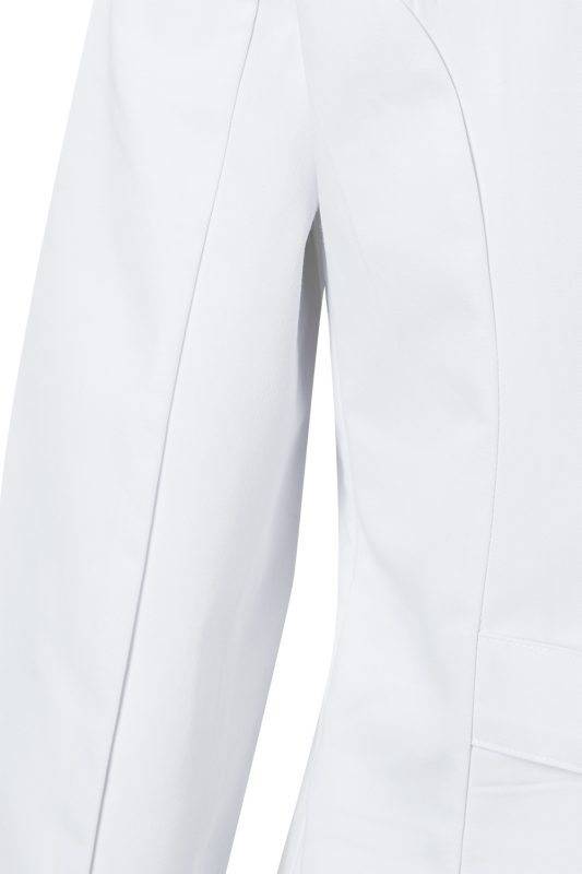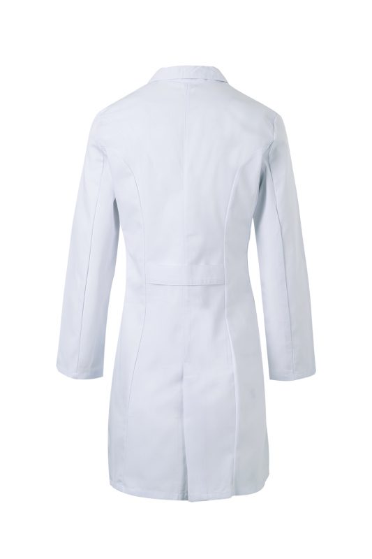 Bata femenina semientallada con manga larga tipo sastre, cinturón trasero y pinzas. Confeccionada en resistente sarga de 210 g/m². Profesional y cómoda.