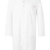 Bata unisex de corte clásico con cierre de botones, cinturón posterior y tres bolsillos de parche. Tejido sarga ligero y resistente.