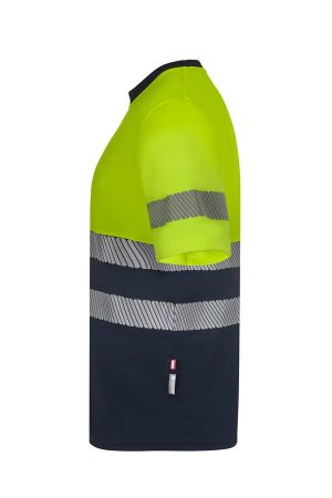 Camiseta bicolor de manga corta con cintas reflectantes segmentadas. Alta visibilidad clase 1, tejido reciclado con certificación GRS y protección solar UPF 50+.