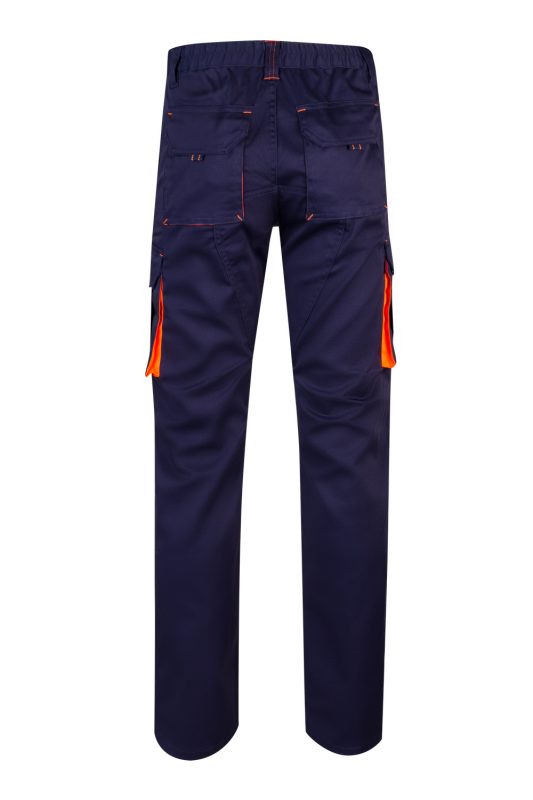 Pantalón de trabajo stretch bicolor, corte slim fit, multibolsillos y cintura elástica. Con detalles en contraste y refuerzo trasero.