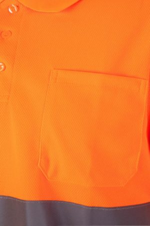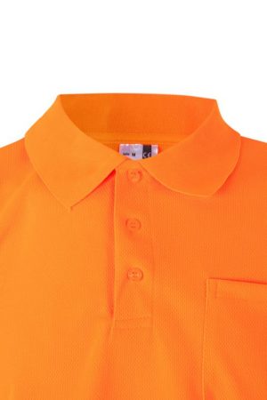 Polo de alta visibilidad con cintas reflectantes, tejido transpirable y diseño funcional para trabajos en exteriores con visibilidad reducida.