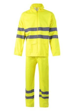 Conjunto impermeable de chaqueta y pantalón con cintas reflectantes y capucha oculta. Protección total contra la lluvia y alta visibilidad para máxima seguridad.
