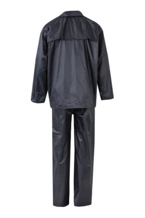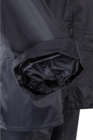 Conjunto impermeable con costuras termoselladas y rejilla interna para mayor transpirabilidad. Chaqueta con capucha oculta, cierre con cremallera y bolsillos con tapeta. Pantalón con cinturilla elástica y aberturas laterales. Incluye bolsa para guardado.