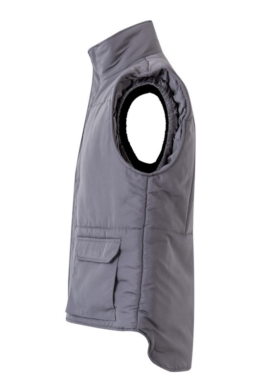 Chaleco acolchado de trabajo con cierre de velcro, cortavientos en sisas y múltiples bolsillos funcionales. Ideal para climas fríos.