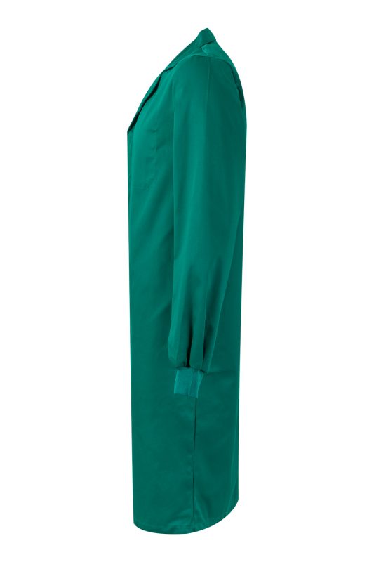 Bata laboral con cierre de automáticos ocultos y puños de canalé, diseñada para ofrecer comodidad, durabilidad y facilidad de uso en entornos profesionales.