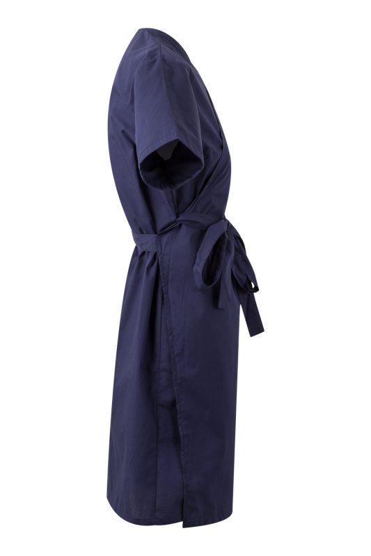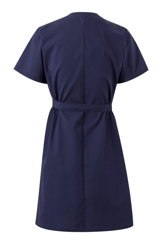 Bata cruzada femenina con cintas ajustables, pinzas en pecho y diseño funcional, ideal para comodidad y libertad de movimiento en entornos profesionales.