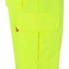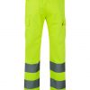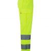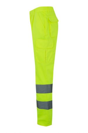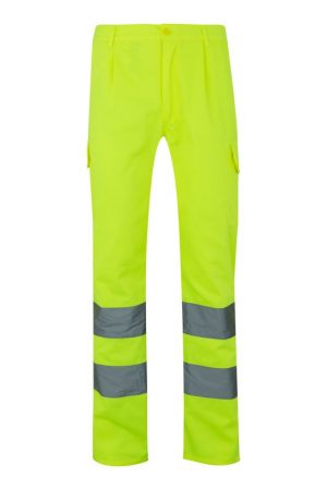 Pantalón de alta visibilidad con múltiples bolsillos y cintas reflectantes en el bajo, diseñado para asegurar comodidad y seguridad en trabajos de riesgo.