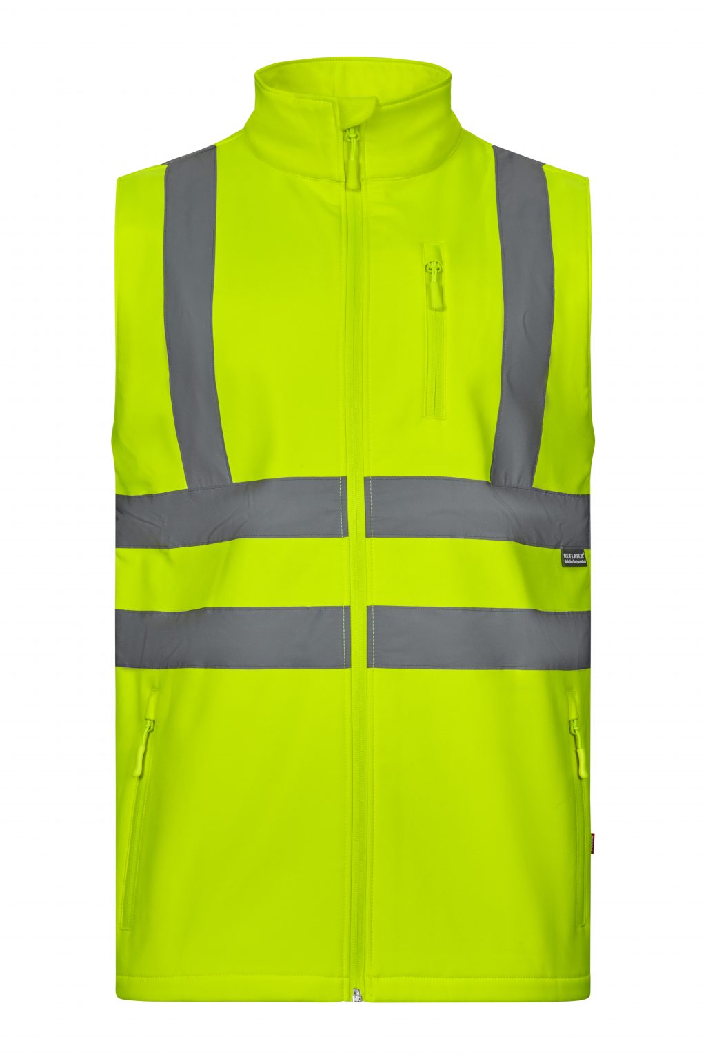 Chaleco soft shell tricapa con cintas reflectantes en torso y hombros. Alta visibilidad clase 2 con protección térmica, ligereza y funcionalidad.