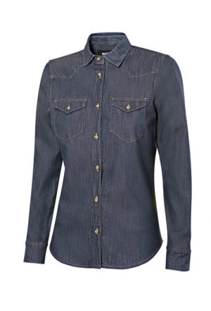 Camisa denim entallada con tejido elástico y bolsillos frontales. Ideal para personal femenino en hostelería.