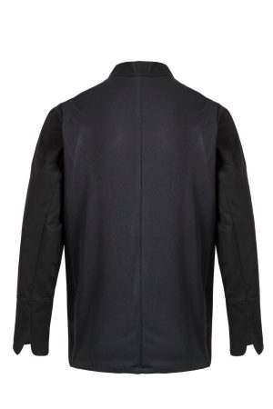 Chaqueta de cocina profesional con diseño asimétrico y tejido técnico transpirable en la espalda. Comodidad y frescura para largas jornadas.
