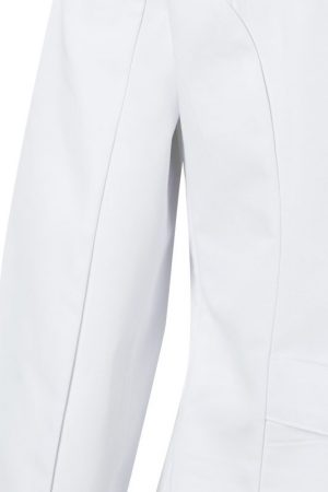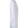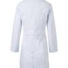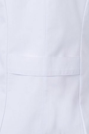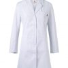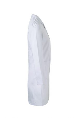 Bata femenina semientallada con manga larga tipo sastre, cinturón trasero y pinzas. Confeccionada en resistente sarga de 210 g/m². Profesional y cómoda.
