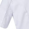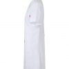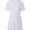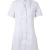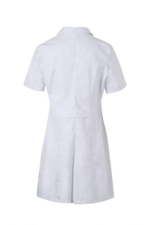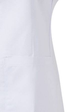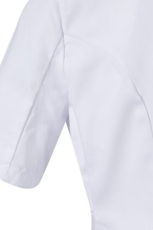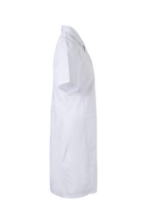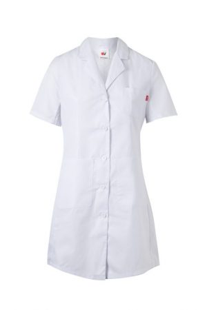 Bata de mujer con manga corta tipo sastre, pinzas de entalle y cierre con botones. Confeccionada en sarga ligera de 190 g/m². Comodidad y estilo profesional.