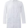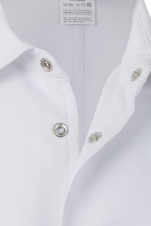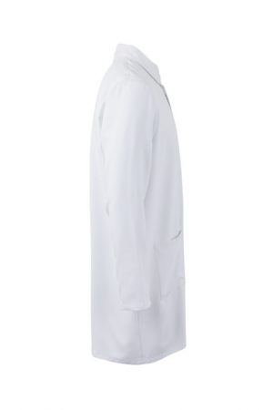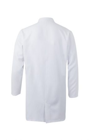 Bata profesional de microfibra con tratamiento antibacteriano, cuello camisero, cierre automático y diseño ligero y funcional.