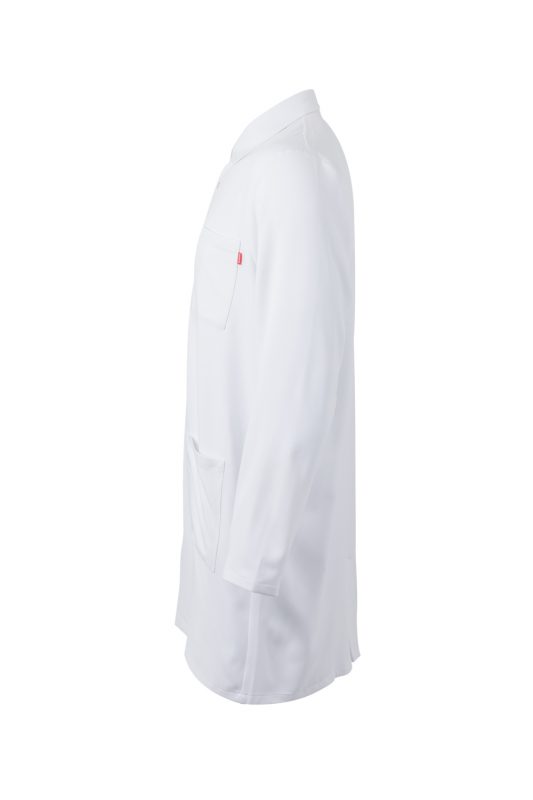 Bata profesional de microfibra con tratamiento antibacteriano, cuello camisero, cierre automático y diseño ligero y funcional.