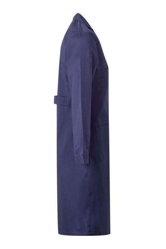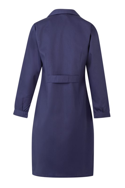 Bata de mujer con manga larga, puños abotonados, cierre de botones y cinturón trasero. Tres bolsillos de parche. Tejido sarga ligero y resistente.