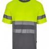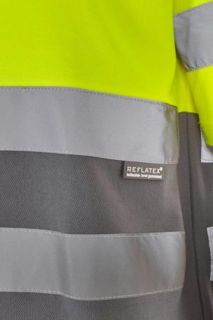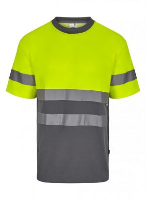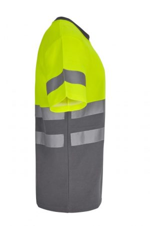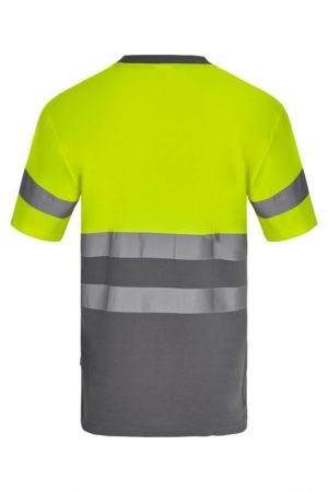 Camiseta bicolor de manga corta con cintas reflectantes. Alta visibilidad clase 1 según EN 20471. Confort y seguridad en tejidos naturales para uso profesional.