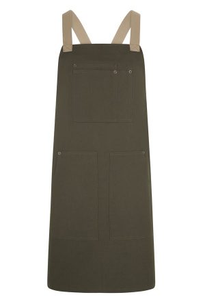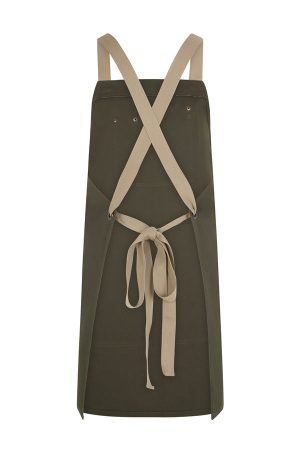 Delantal robusto y moderno con espalda cruzada y detalles en contraste, ideal para destacar en entornos profesionales con estilo y funcionalidad.