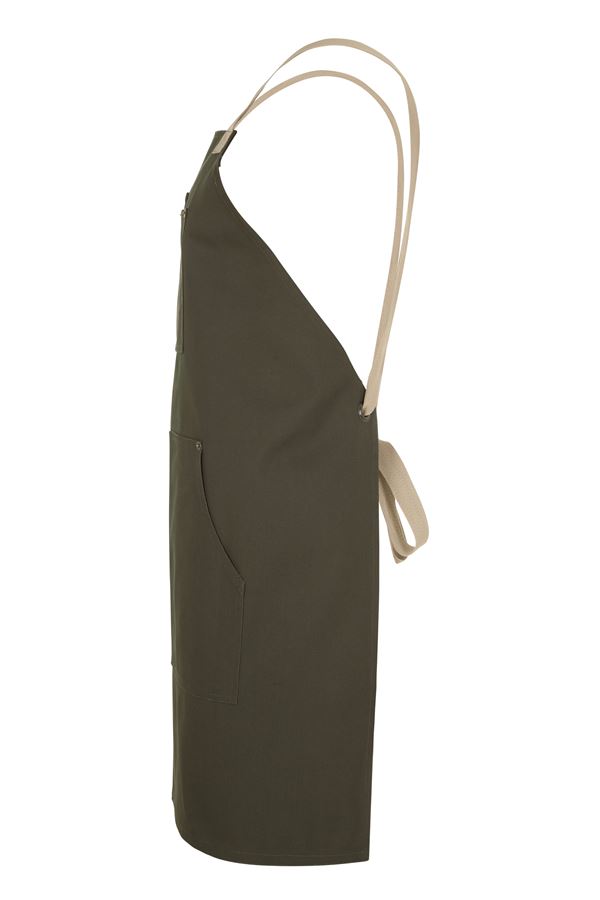 Delantal robusto y moderno con espalda cruzada y detalles en contraste, ideal para destacar en entornos profesionales con estilo y funcionalidad.