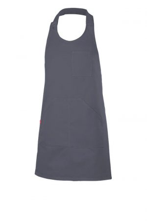 Delantal corto y funcional con cuello ajustable y múltiples bolsillos, ideal para profesionales que combinan comodidad, organización y estilo.