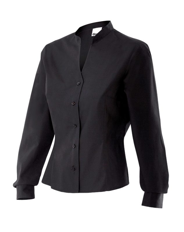 Camisa con cuello mao y cierre francés sin tapeta. Corte entallado con pinzas y puños ajustables, ideal para un look pulido y cómodo en entornos profesionales.